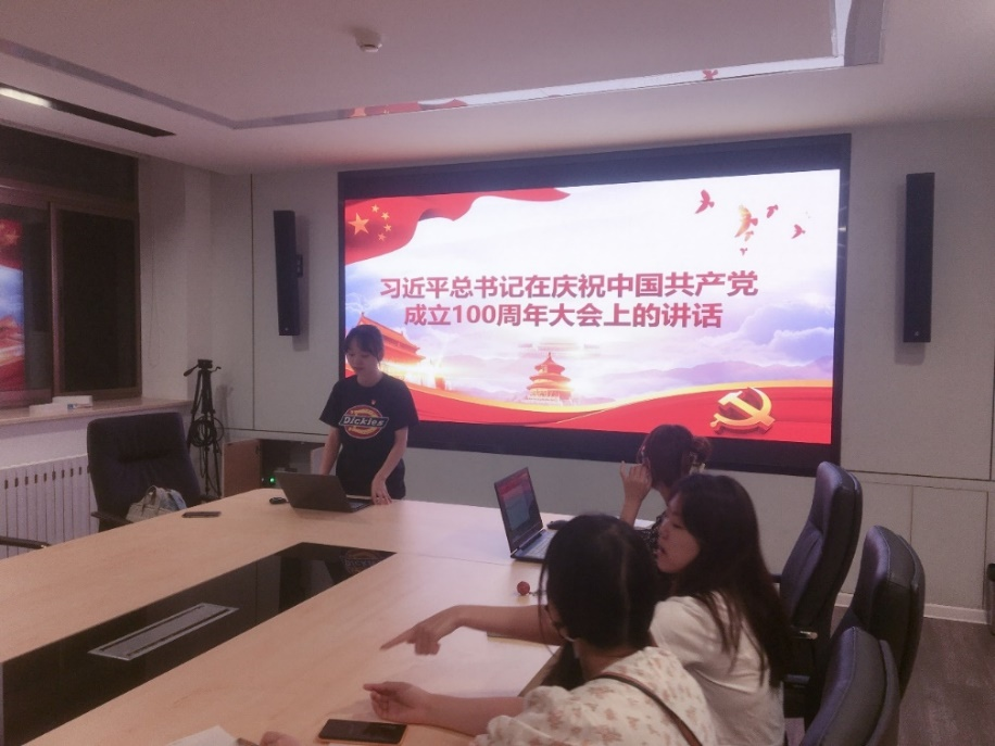 会议伊始,团支部书记谭竹嫣针对此次团日活动的具体事项进行了解说,并将习近平总书记在庆祝中国共产党成立100周年大会上的讲话精神从三大历史贡献、三大历史启示、八个坚持与继续三个方面进行讲解说明。会议强调支部全体成员应该深刻领会和把握习近平总书记“七一”重要讲话的重大意义、丰富内涵、核心要义、实践要求,自觉牢记在心中、坚决落实到行动上。