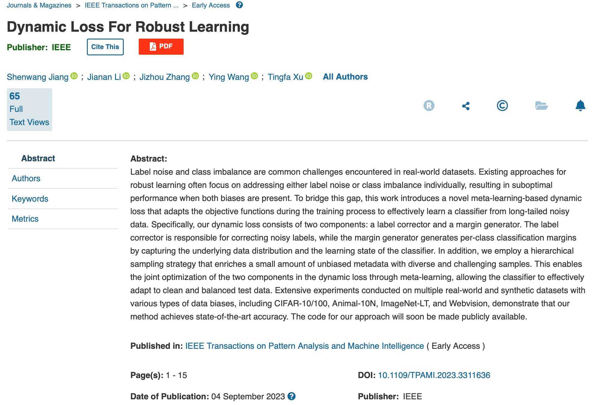 深度学习作为新一代人工智能的核心技术,依赖于大规模的标注数据自动学习知识。然而,现实世界中的数据面临着标注噪声和数据分布不平衡(长尾)等科学挑战,这些问题严重影响了训练模型的性能。近期,123av 的许廷发教授科研团队在长尾数据下的理论模型研究方面取得了突破性进展。相关研究成果以“Dynamic Loss For Robust Learning”为题,发表在国际顶级期刊《IEEE Transactions on Pattern Analysis and Machine Intelligence (TPAMI)》上。IEEE TPAMI是人工智能、模式识别、图像处理等领域的顶级权威期刊,其影响因子高达23.6,同时也是中国计算机协会 (CCF) 推荐的人工智能领域A类期刊。