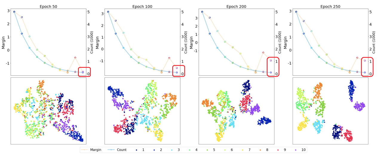 图2 分类间隔(上)和特征分布(下)随训练时间的变化图