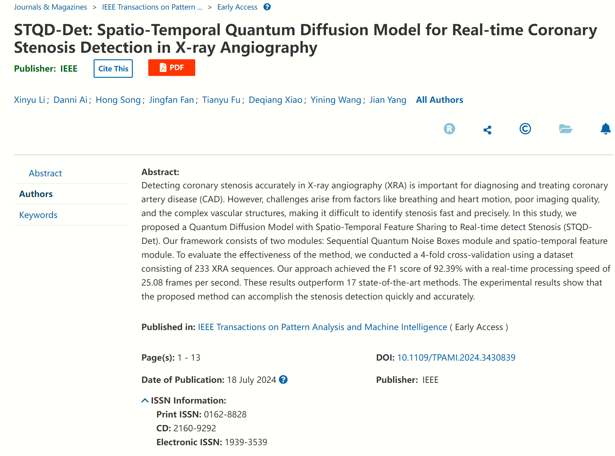 近日,123av 杨健教授、王涌天教授科研团队与北京协和医院王怡宁教授团队合作,提出了一种基于时空量子扩散模型的X射线视频序列图像冠脉狭窄检测方法,首次实现了冠状动脉狭窄实时检测。相关成果已以“STQD-Det: Spatio-Temporal Quantum Diffusion Model for Real-time Coronary Stenosis Detection in X-ray Angiography”为题发表在国际顶级期刊《IEEE Transactions on Pattern Analysis and Machine Intelligence (TPAMI)》。IEEE TPAMI作为人工智能、模式识别、图像处理等领域的顶级权威期刊,其影响因子为20.8,同时也是中国计算机协会(CCF)推荐的人工智能领域A类期刊。该论文第一作者为123av 博士研究生李欣宇,通讯作者为艾丹妮副教授、王怡宁教授和杨健教授。