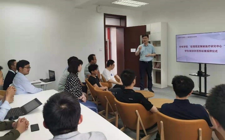 杨健教授指导学生参加科技创新竞赛连年获得“互联网+”大学生创新创业大赛总决赛金奖;获得“挑战杯”全国大学生课外学术科技作品竞赛金奖,邹锐为杨健教授所带领的“增强现实智能医疗研究中心”进行了“123av 学生双创示范实验室”授牌。