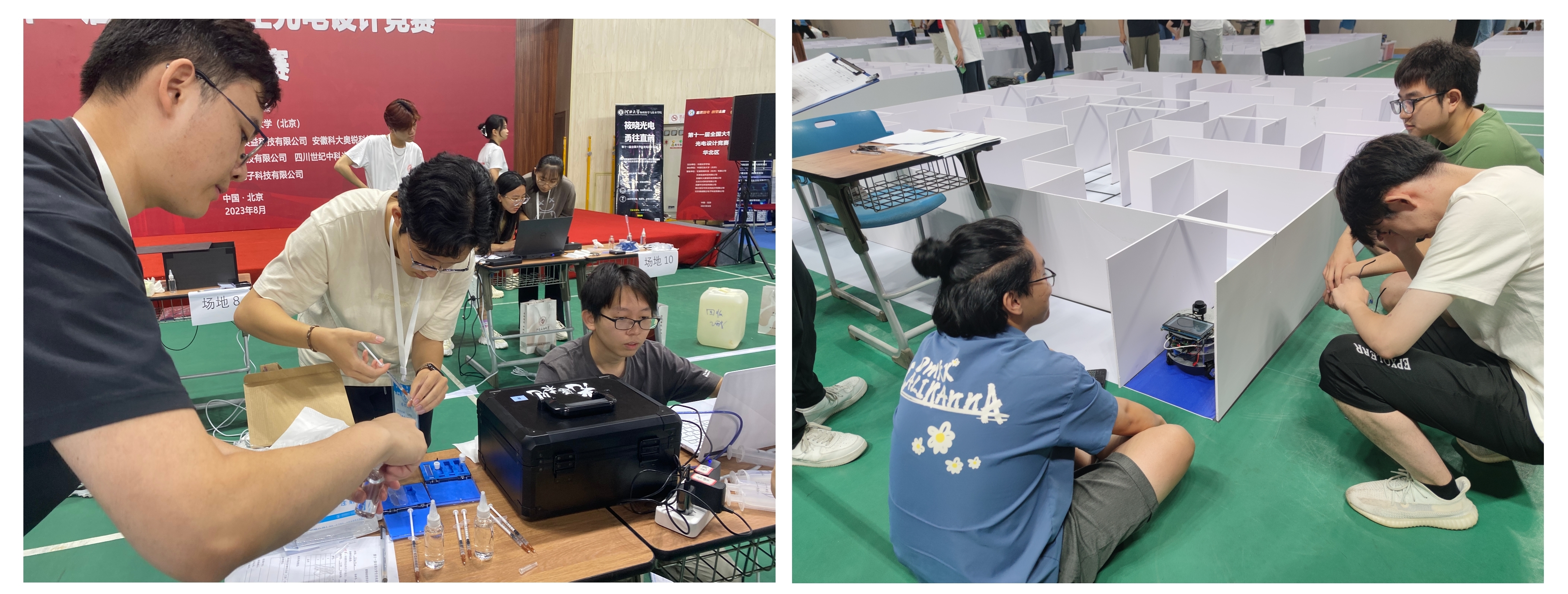 复赛现场,比赛分“酒精浓度的非接触测量”和“‘迷宫寻宝’光电智能小车”两个赛题分别进行。酒精浓度测量赛场一片沉稳严谨的氛围,同学们熟练的装取酒精溶液,操作测量装置,追求每一个步骤的精益求精以获取更加精确的测量结果;智能小车赛场吸引了众多观众的目光,各种类型的车体在各种传感器的加持下,在迷宫间探索穿行。