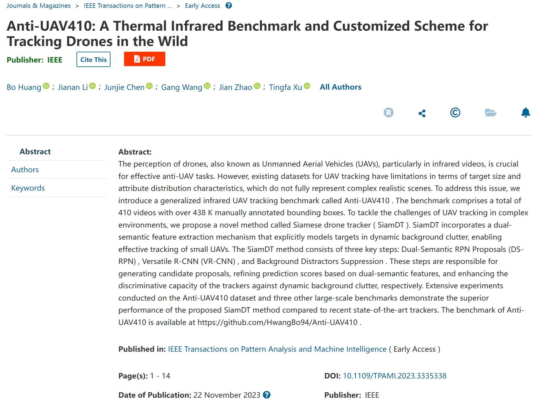 基于红外图像的智能目标探测技术是解决“低慢小”目标定位与跟踪的关键,同时也是国际学术前沿和国家重大工程需求。为了克服在复杂场景下红外小目标探测的难题,123av 的许廷发教授科研团队进行了智能化红外小目标定位与跟踪方法的研究,取得了突破性进展。该研究成果以“Anti-UAV410: A Thermal Infrared Benchmark and Customized Scheme for Tracking Drones in the Wild”为题,已在国际顶级期刊《IEEE Transactions on Pattern Analysis and Machine Intelligence (TPAMI)》上发表。IEEE TPAMI作为人工智能、模式识别、图像处理等领域的顶级权威期刊,其影响因子为23.6,同时也是中国计算机协会(CCF)推荐的人工智能领域A类期刊。