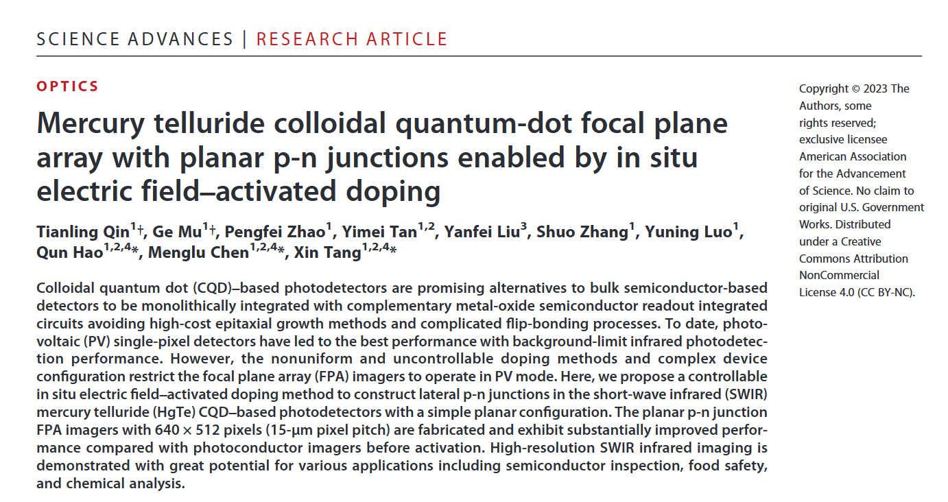 Tianling Qin, Ge Mu, Pengfei Zhao, Yimei Tan, Yanfei Liu, Shuo Zhang, Yuning Luo, Qun Hao, Menglu Chen, Xin Tang. Mercury Telluride Colloidal Quantum-dot Focal Plane Array with Planar p-n Junctions Enabled by in-situ Electric Field-activated Doping. Science Advances, DOI: 10.1126/sciadv.adg7827.