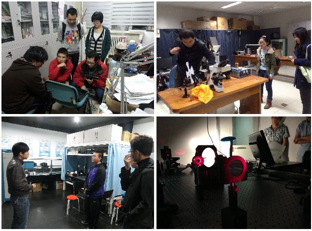 在激光雷达实验室,陈和带领所联系同学们参观并与同学们讨论了“导盲小车”和kinect图像采集功能。刘明老师带领所联系同学们参观了现代光学实验室,介绍了很多前沿的新科技和新成果,拓宽了专业视野。