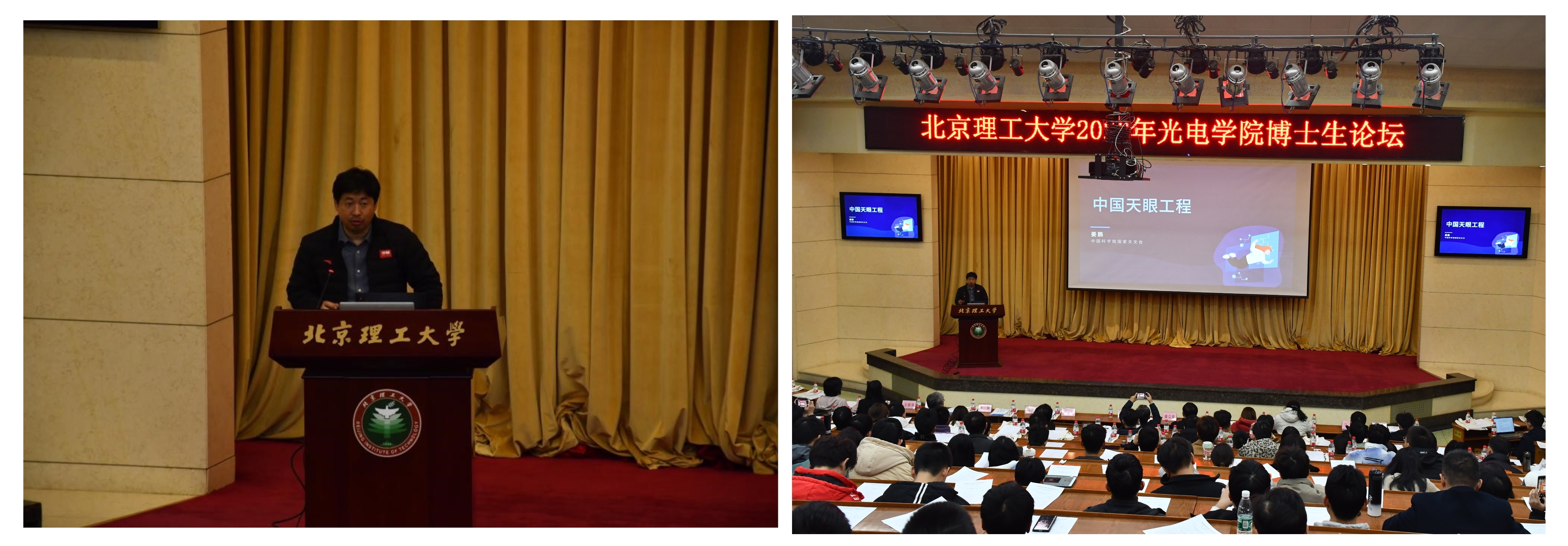 姜鹏专家为国家天文台研究员、贵州射电天文台台长,目前担任中国天眼总工程师,所报告的主题是中国天眼工程。姜鹏台长分别讲述了FAST设计方法及其特点,深入浅出地介绍了快速射电暴、最短轨道周期脉冲双星系统等概念,寻求突破人类视野极限的天文观测方法。最后谈及FAST未来发展。整场报告丰富精彩,为在场师生开拓眼界。