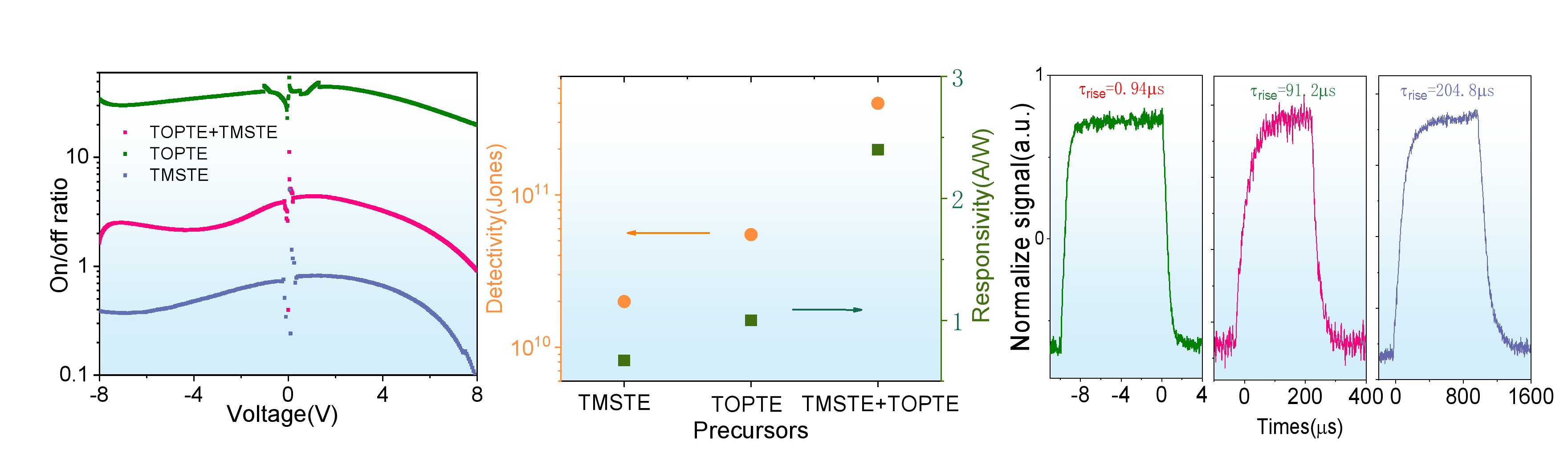 郝群教授团队陈梦璐准聘教授等人,提出了量子点带尾调控方法,通过量子点成核生长分离的再生长技术,成功得到了形貌可控(图1),分散性好,半峰宽窄,带尾态优的红外量子点,大幅度减小器件的暗电流和噪声30倍以上,室温下2.5微米延展短波波段比探测率达到4×1011 Jones,响应时间为0.94微秒(图2)。相关工作于2023年11月发表于中科院1区光学顶刊ACS Photonics。