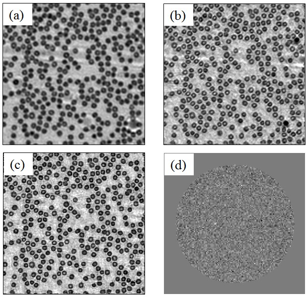 图3人体血细胞图像重建结果。(a)原始低分辨率图像;(b)未更新光瞳函数重建结果;(c)本文方法重建强度图像;(d)本文方法重建光瞳函数