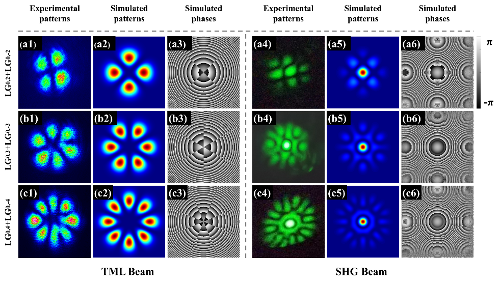 研究工作创新性的探索了谐振腔内横模锁定结构光束的二次谐波产生现象,通过理论仿真与实验验证为大家介绍了横模锁定结构光束的频率变换效果,并呈现了众多前所未见的绿光结构光束。图1是倍频光生成的理论分析及仿真,证明了横模锁定光束与未锁定光束的非线性频率变换后谐波光强分布具有明显区别,且可以据此判断基频光的模式锁定状态。