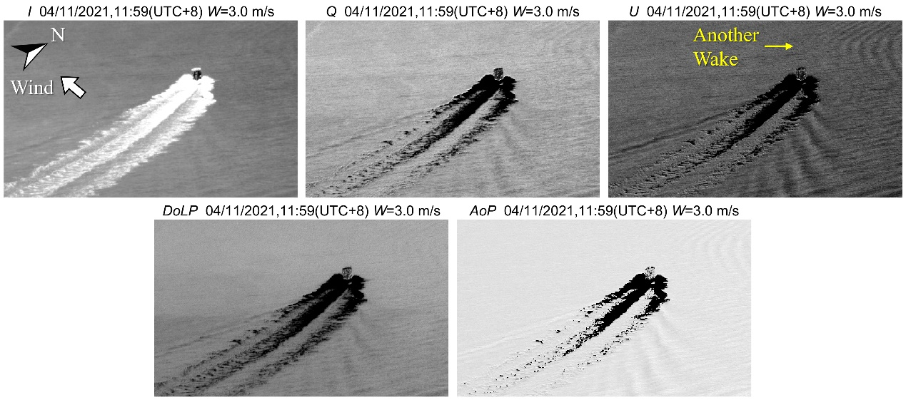 针对这一科学问题,123av 金伟其教授团队率先提出利用光学偏振成像技术进行水下运动目标水面尾迹的机载遥感观测,并通过理论建模、仿真和实验手段论证了技术可行性。研究结果表明,团队采用的线偏振Stokes 矢量图像具有比传统强度图像更好的尾迹目标对比度,成像质量对海况、光照等环境因素的影响具有较好的鲁棒性;且使用的DoFP偏振成像系统可很好地集成到无人机平台实现灵活便捷的航拍遥感探测;进一步地,研究团队利用获取到的偏振海面尾迹图像信息,实现了水下运动目标运动状态解译、海面三维面型复原等诸多应用。除了在海洋安全方面的重要意义,该项研究也为中小尺度海洋动力过程的观测提供了有效的技术参考。