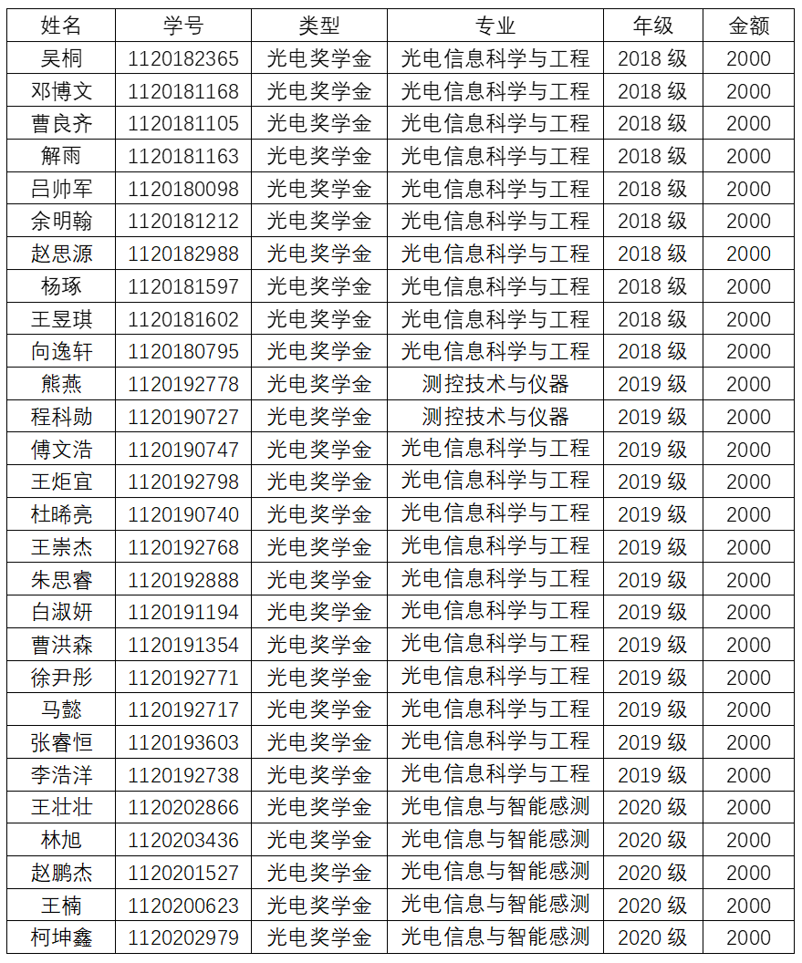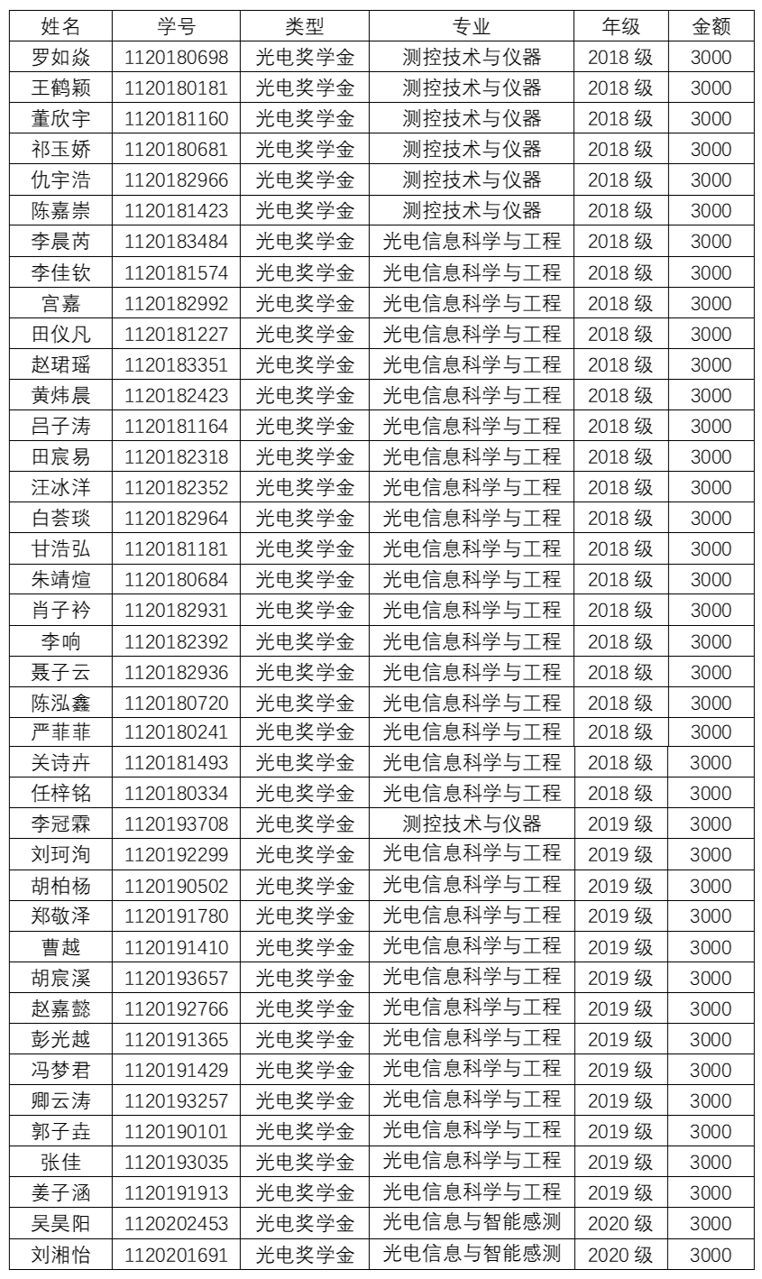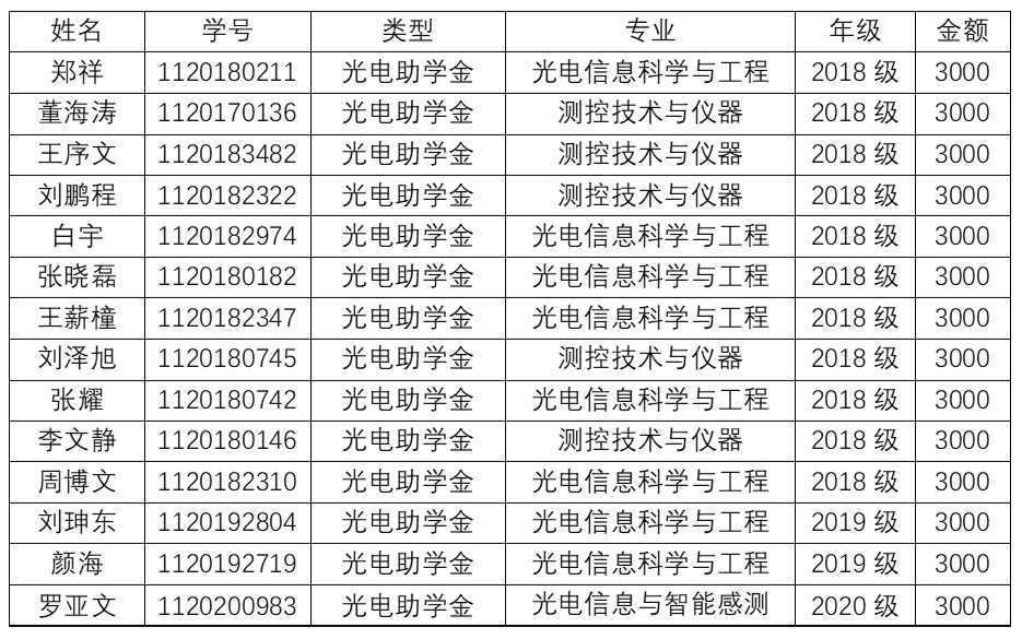 2020-2021学年“光电奖助学金”评选结果